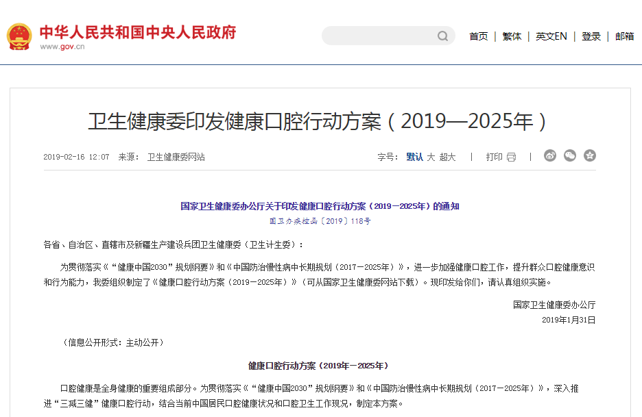 隨著消費水平的提升與健康意識的覺醒,消費者對口腔健康的重視程度日益增強。國家衛生健康委辦公廳在2019年1月印發的《健康口腔行動方案(2019-2025年)》中明確提出了健康口腔行動工作指標。方案倡導,在2025年,成人每天2次刷牙率(%)將由2016年的36.1%提升至2025年的45%,并指出要推動口腔健康制造業創新升級。